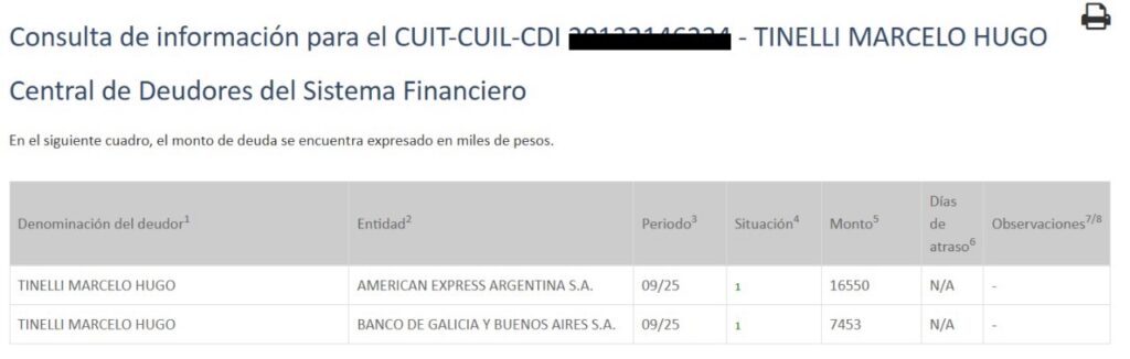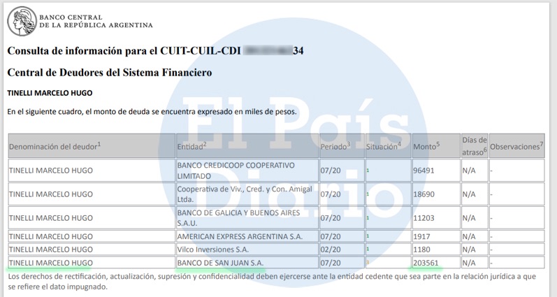 La información sobre deudores del Banco Central puede consultarse con el numero de Cuit/Cuil de la persona/empresa en https://www.bcra.gob.ar/BCRAyVos/Situacion_Crediticia.asp