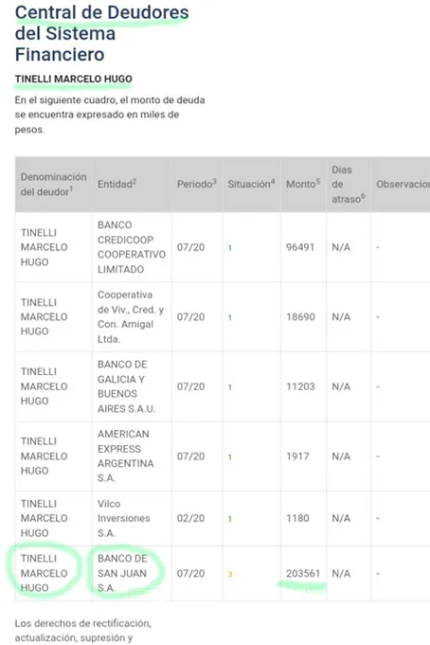 Consultados los datos actualizados del Banco Central (noviembre de 2025), CUYOVISIÓN confirmó que Marcelo Tinelli ya no figura como deudor en mora del Banco San Juan. Las últimas menciones en la Central de Deudores datan de deudas a otras entidades financieras, lo que sugiere que la obligación fue cancelada, refinanciada o dada de baja. Aunque no existe constancia pública de pago, fuentes del sector señalan que el conductor habría regularizado sus pasivos en 2023, cuando se incorporó al canal América TV y sus nuevos socios ayudaron a reordenar su situación financiera.