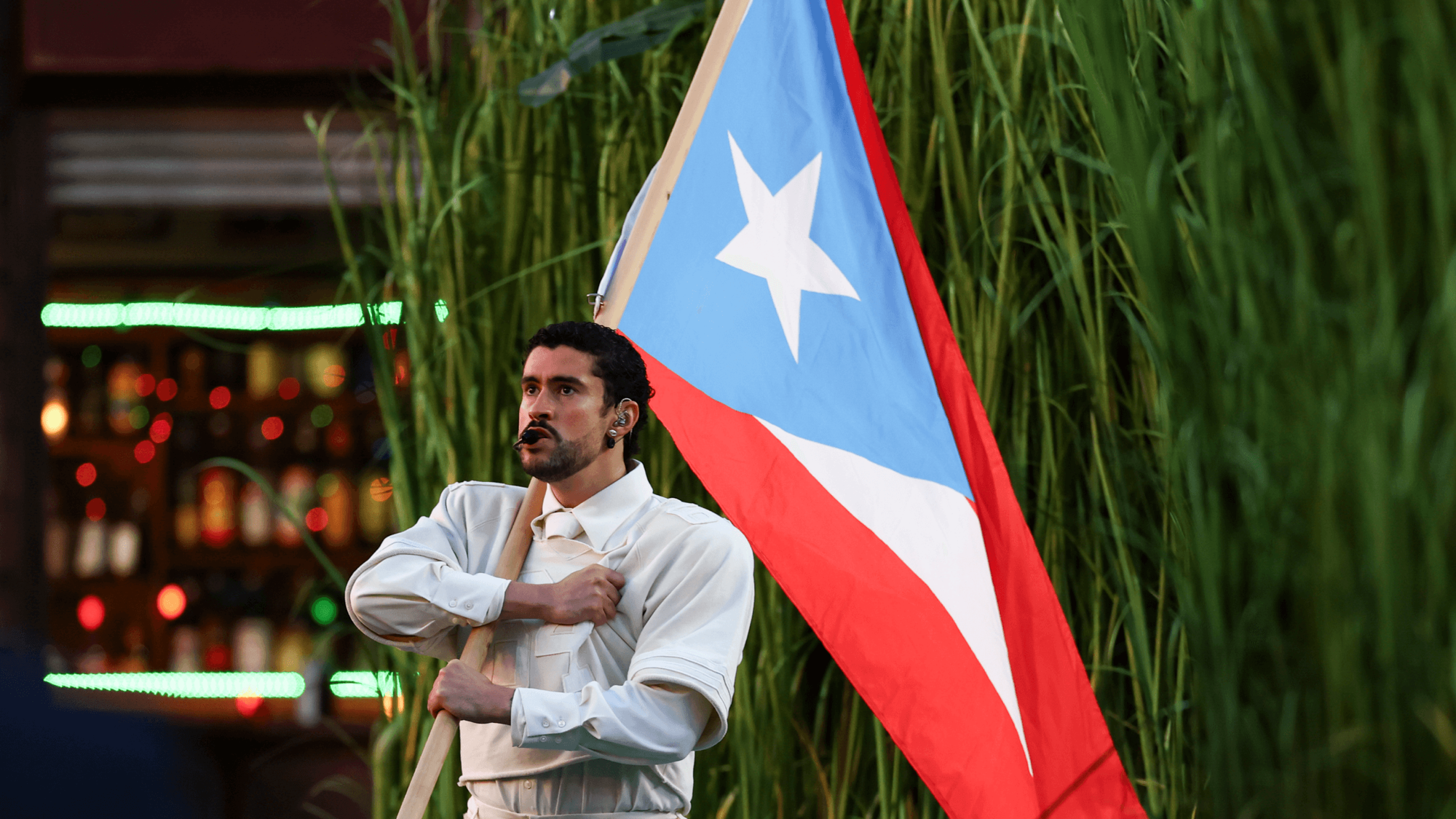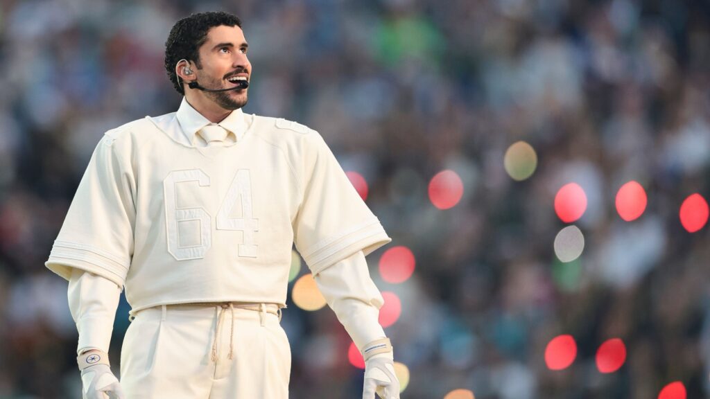 El cantante puertorriqueño desplegó un show de alto impacto visual, con una escenografía que recreó paisajes típicos de Puerto Rico: cañaverales, casas bajas y carritos de comida. Vestido de blanco, con un traje inspirado en los uniformes de la NFL y el número 64 en el pecho, apareció en escena con un balón de fútbol americano y abrió el espectáculo interpretando “Tití me preguntó”, “Yo perreo sola” y “Safaera”.