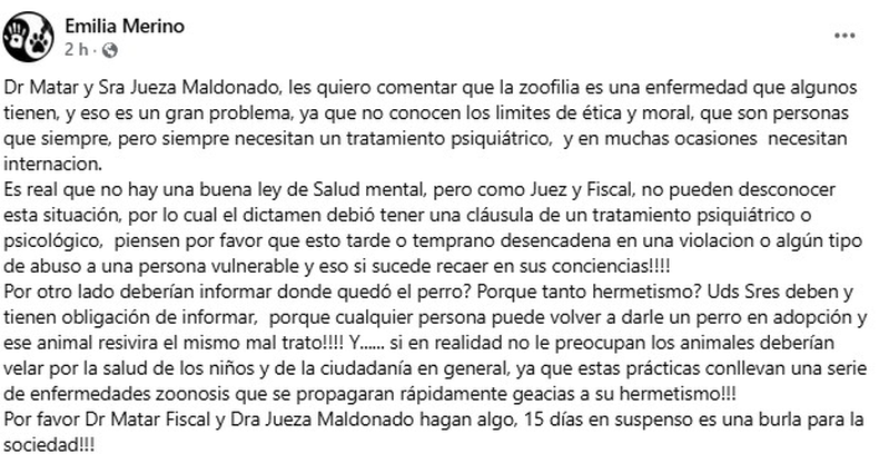 Tras conocerse el fallo, la proteccionista Emilia Merino, integrante de Sala de Emergencias, expresó públicamente su rechazo a la resolución y cuestionó la falta de medidas complementarias.