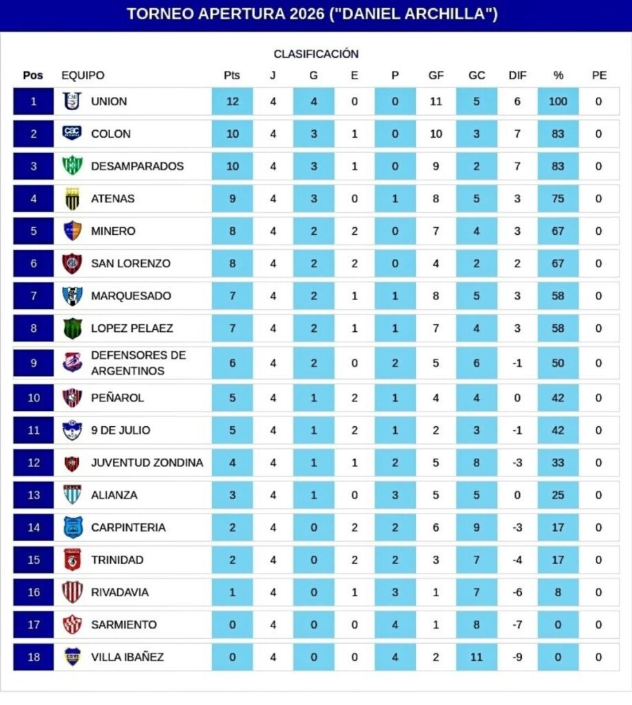 Con la fecha completa, Unión lidera con 12 puntos, seguido por Colón Junior y Desamparados con 10. El Apertura comienza a perfilar candidatos y la lucha por la cima promete sostenerse en las próximas jornadas.