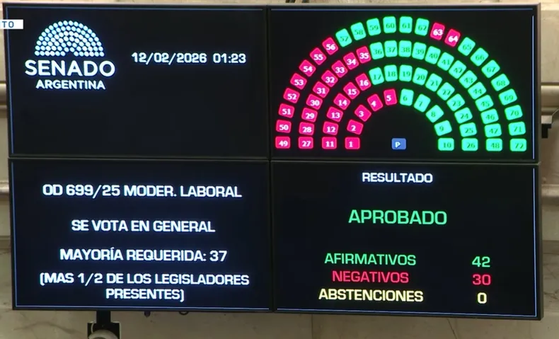 Luego de más de 12 horas de un debate caldeado, el Senado de la Nación dio media sanción en la madrugada de este jueves a la reforma laboral. El Gobierno logró construir una mayoría de 42 votos positivos gracias al apoyo del PRO, la UCR y bloques provinciales aliados, superando los 30 votos negativos del interbloque de Unión por la Patria.